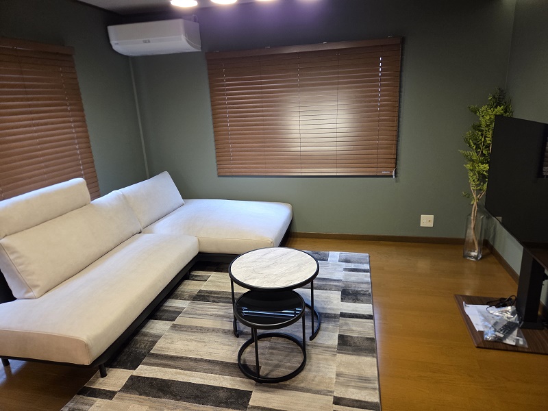 ウッドブラインドの温もり感とグリーンの壁紙がマッチして良い感じに!ソファの直線的なデザインとラグの幾何学柄も相性がよくお客様にも大変満足して頂きました!Y様ありがとうございました!